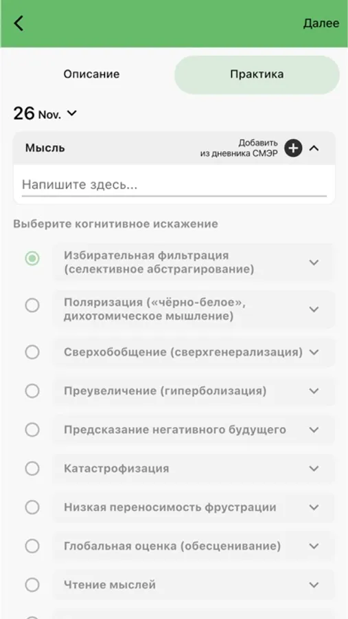 Заполнение данного дневника и последующий анализ записей позволит вам взглянуть на ваши мысли-убеждения с разных сторон и понять, что возможно, где-то вы совершаете ошибку. А раз ошибка найдена, то можно будет ее устранить, посредством формирования нового отношения к ситуации и изменения дисфункциональных мыслей и убеждений.