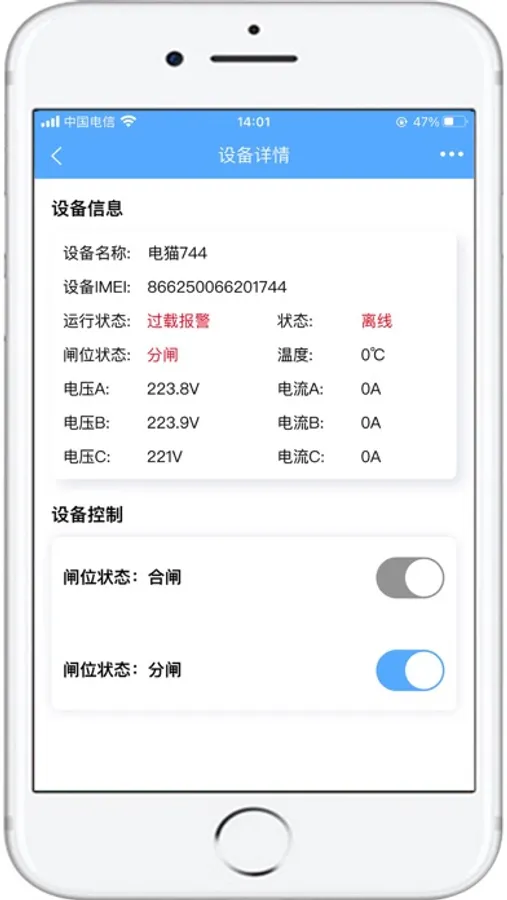 智能电猫:实时显示设备数据,远程控制开关合闸分闸,预警信息推送和显示。