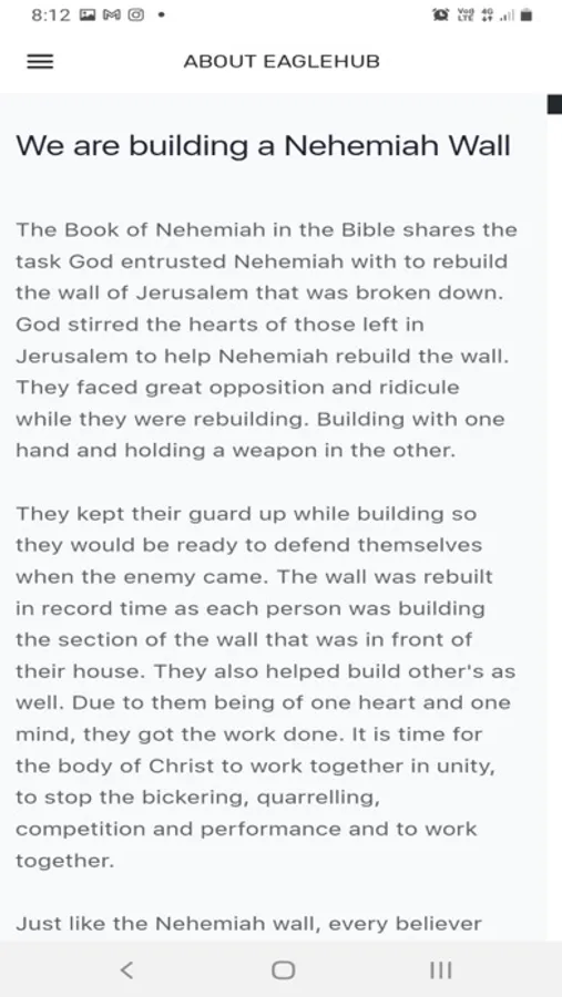The EagleHub is a central online social community for like-hearted, like-minded believers and followers of Jesus Christ. Our services are designed to allow the body of Christ to connect, share, learn, and grow together in their walk with Jesus by sharing the Gospel and adhering to Biblical principles. Emphasis is placed on growth and equipping of believers who want to impact their world for Jesus. This is for those believers who don't want to be fed "milk" but "solid food". Expect to be challenged, to learn, to share, to encourage, to be encouraged, to pray for others, to be prayed for, to receive gentle correction, to provide gentle correction, to be humble and respectful, to share your giftings, to allow others to share their giftings etc. This is a no-competition, no-self-promoting platform. This is where the true pure Gospel is preached and taught without compromise so the body of Christ can be "build-up" to go and make disciples of all nations.