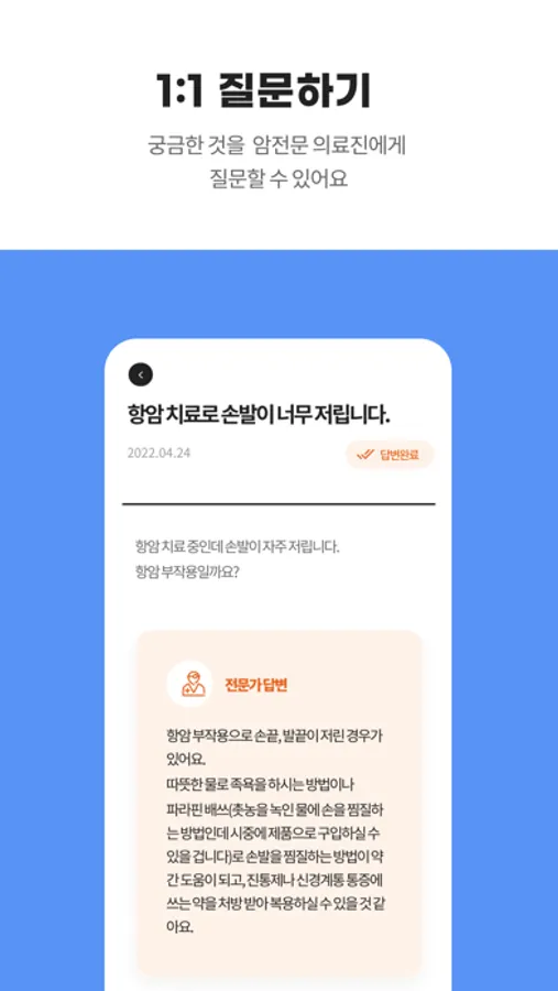 암 치료에 관해 궁금한 것을 암전문 의료진에게 질문할 수 있어요.