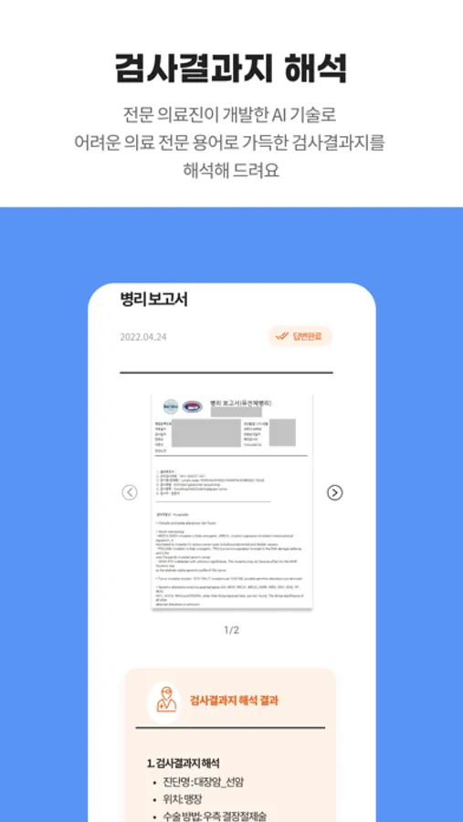 전문 의료진이 개발한 AI 기술로 어려운 의료 전문 용어로 가득한 검사결과지를 해석해 드려요.