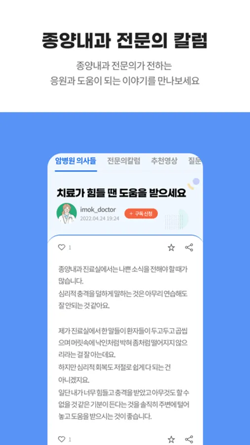 종양내과 전문의가 전하는 응원과 도움이 되는 이야기를 만나보세요.