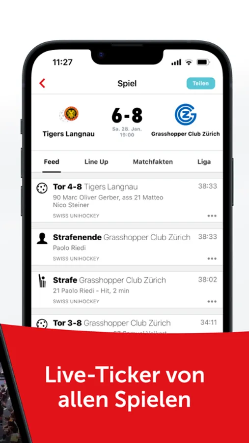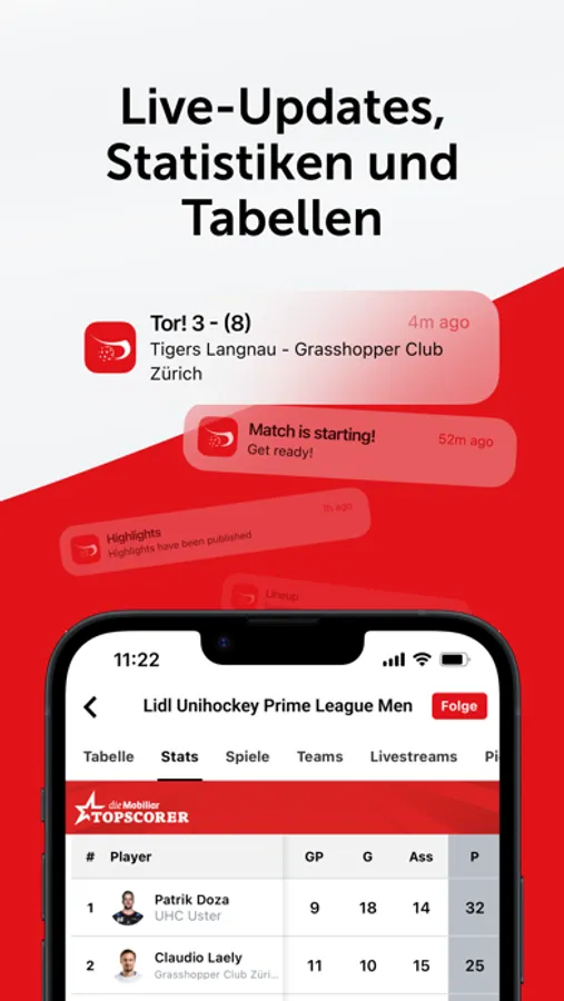 Erstelle dein persönliches Konto, folge den Teams, an denen du interessiert bist, und behalte den Überblick über alle Spiele, Spielpläne, Kader, Tabellen und Statistiken. Schau dir die Spiele im Livestream an, erhalte Live-Ergebnisse und Benachrichtigungen, wenn das Spiel beginnt oder ein Tor passiert – und dies nicht nur für die Top-Ligen, sondern für alle Schweizer Unihockey-Ligen.