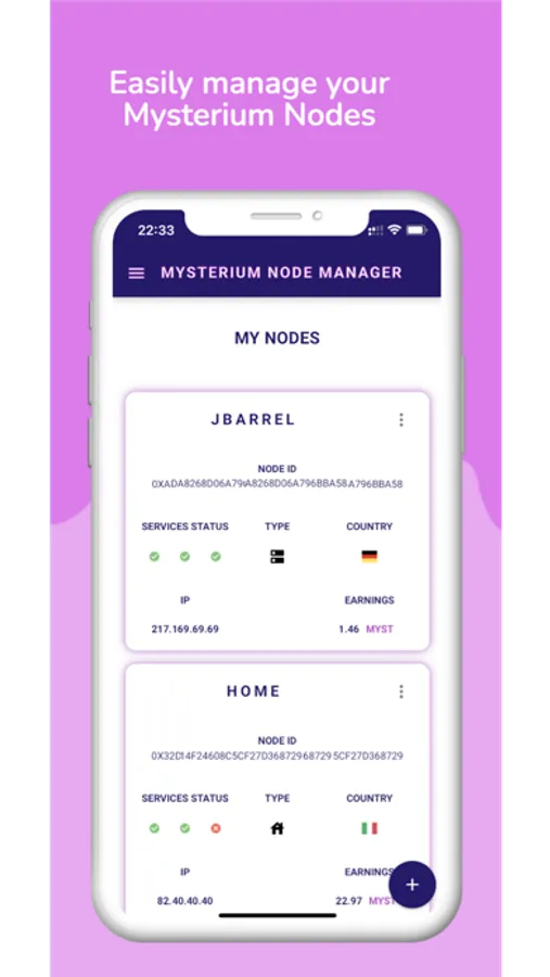 You can view your own nodes, add new ones, delete them, manage services (switch on and off)
