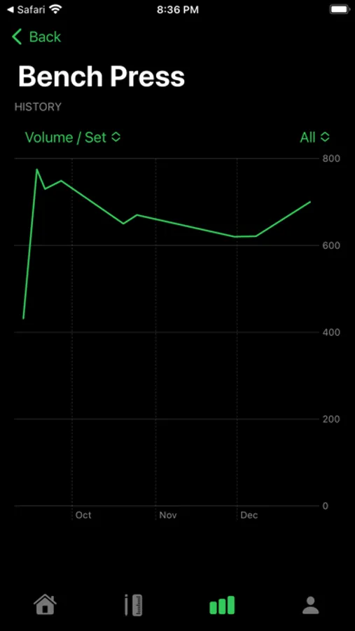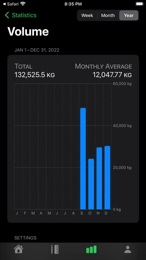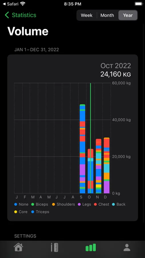- Graphs of key metrics such as volume lifted and calories burned, with a breakdown visible by exercise or category