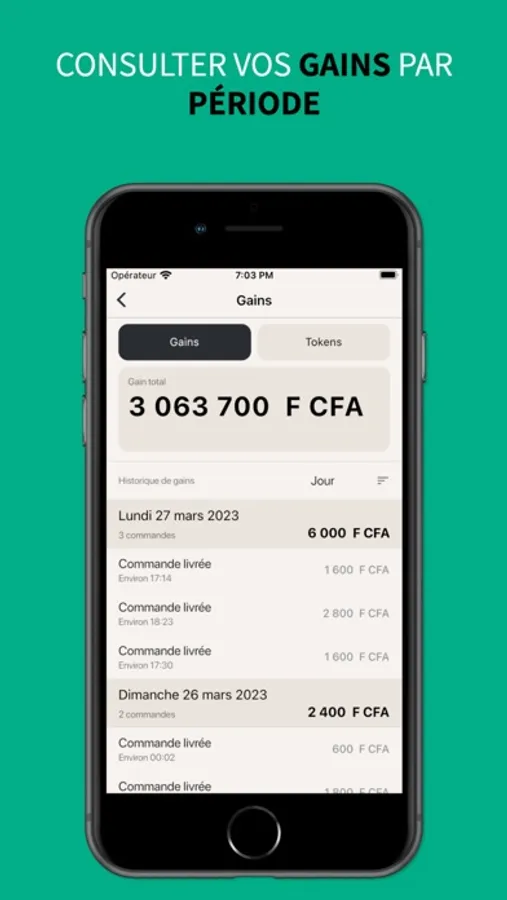 L'application fournit également des statistiques de gains et de jetons achetés pour aider les livreurs à suivre leur revenu et leurs dépenses. Les utilisateurs peuvent voir un aperçu de leur solde actuel ainsi que l'historique complet de leurs gains et dépenses.