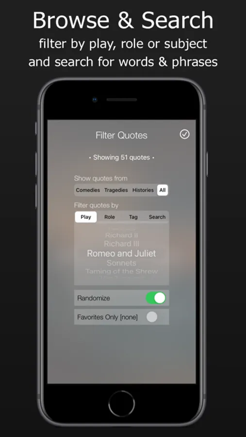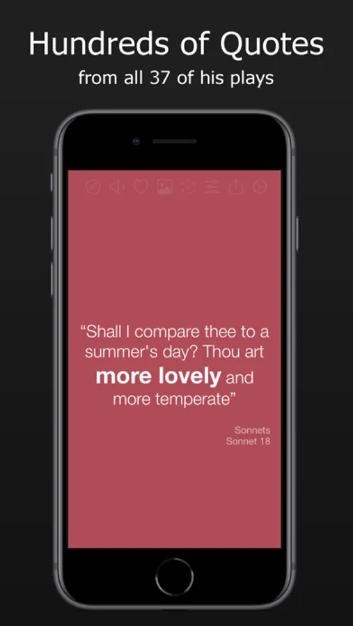 Here, presented in a fun and attractive interface, are several hundred quotes William Shakespeare 37 plays, ranging from the most well known to the most wise, most funny and most obscure. Tap and swipe your way through the quotes and save your favorites. Quotes can be filtered by subject or by year, or searched by keyword.