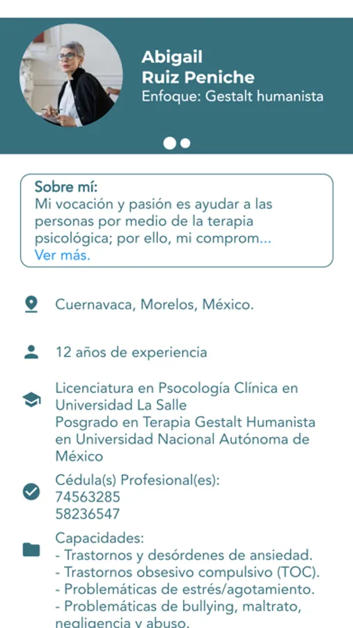 Cada profesional de la salud tiene una ficha con los datos más relevantes de su experiencia profesional y académica, incluyendo su cédula profesional, información que se encuentra a disposición para el público en general para su revisión exhaustiva, a fin de que su decisión al contratar un servicio esté basada en información confiable y suficiente.