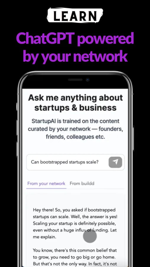 1) [Learn] StartupAI → ChatGPT but powered by your network. Ask anything about startups & business. StartupAI is trained on the content curated by your network—founders, friends, colleagues etc.