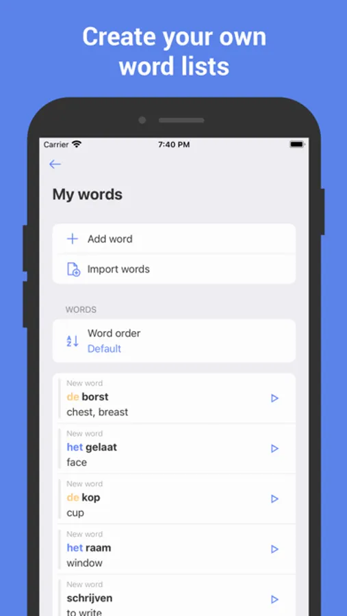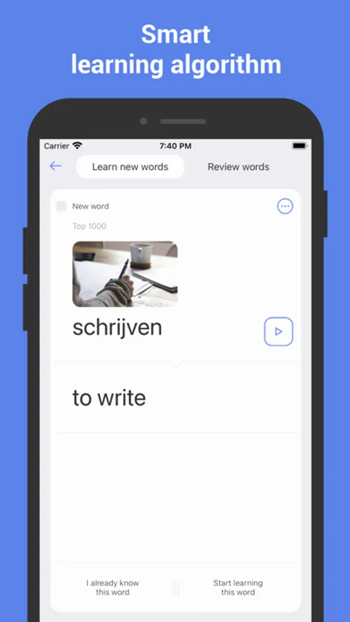 ReWord is a highly effective Dutch vocabulary app. It is your best tool to learn Dutch language and improve your vocabulary. Did you know you can learn languages just taking 5-10 minutes a day? With our interval system, your Dutch lessons will reach a new level. And will give you great results, of course!