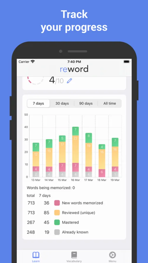 • Spaced repetitions really work: ReWord has a science-based approach to memorizing foreign words so you can learn languages at the highest efficiency.