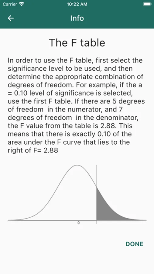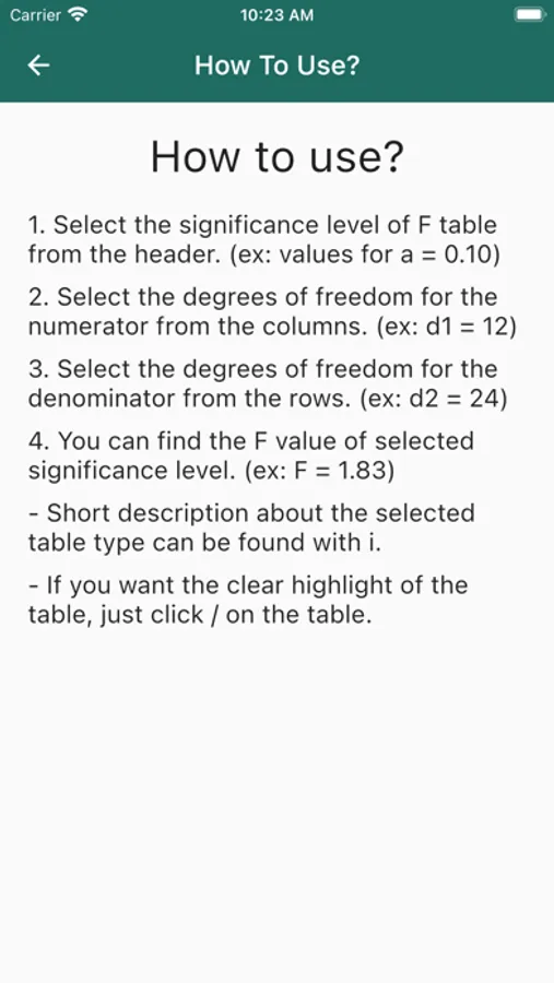 The F table application can be benefited in quality concerns and statistic lessons. It includes basic explanations and the F table in a usable format.
