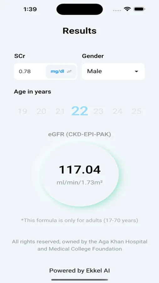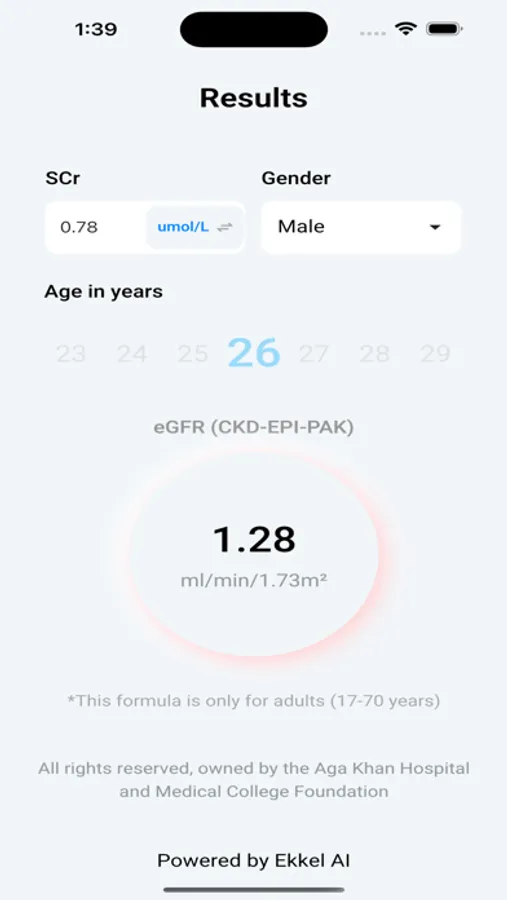 This is an eGFR calculator app which takes into account a variation of the original GFR formula. The new formula pertains to Pakistani population and has been found to be more effective in the domain. The content in this app is for informational purposes only. It does not substitute professional medical advice or consultations with healthcare professionals. Kindly seek professional medical help in addition to using this mobile app.
