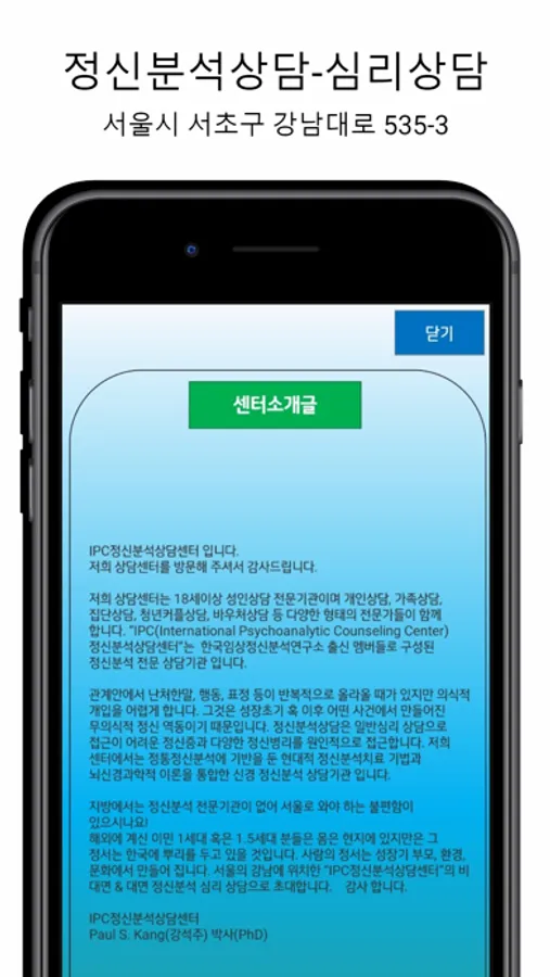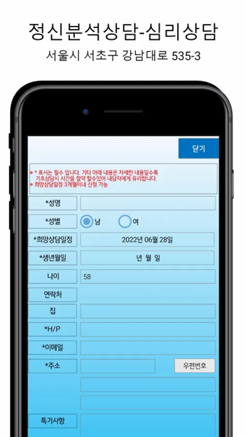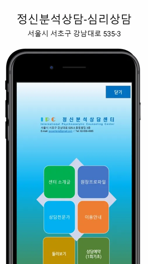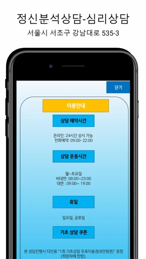 정신분석상담전문기관입니다. 1회기초상담을 먼저 권유드립니다, 상담후 불편하셨다면 전액 환불해드립니다. 예약부터 결제까지 앱에서 할수 있습니다.