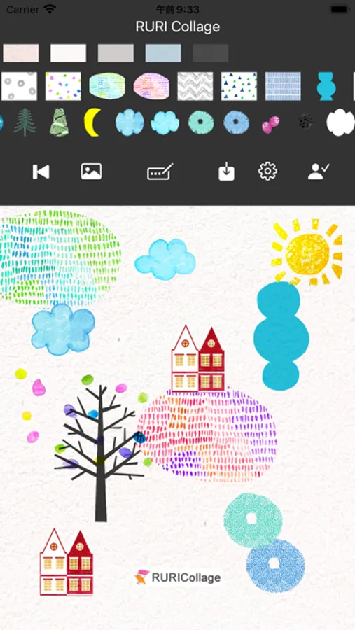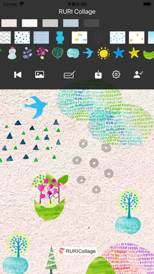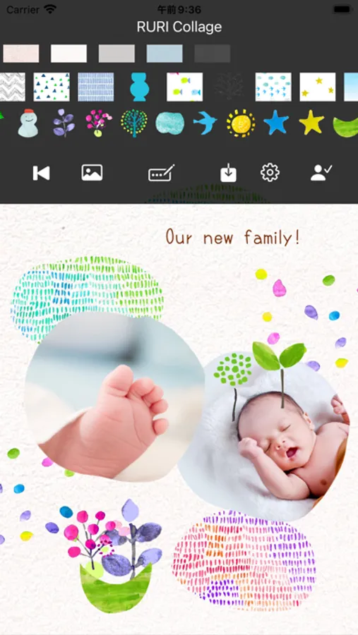 Select background color, patterns and stamps from scrolling images, add photos and texts if you want.