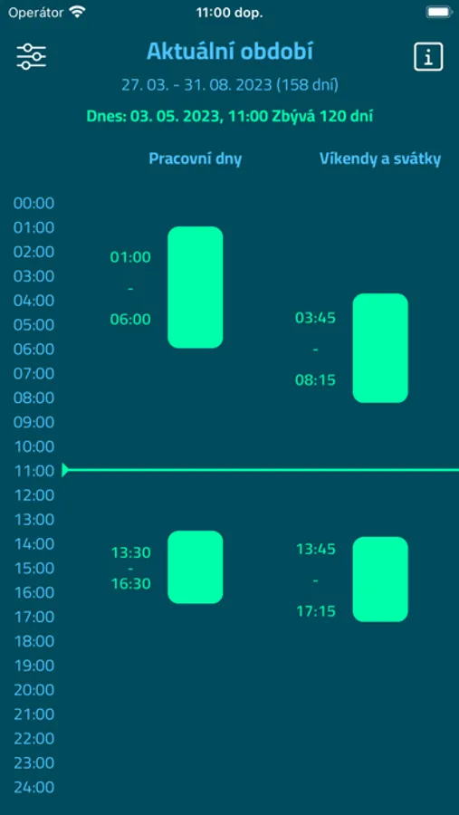 Aplikace slouží ke zobrazování časového rozvrhu nízkého a vysokého elektrického tarifu na přehledné časové ose.