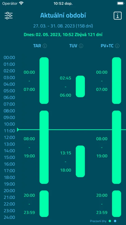 Aplikace dokáže zobrazit rozvrh pro jedno nebo pro tři relé (nízký tarif elektřiny, ohřev teplé užitkové vody, přímotopné vytápění + tepelné čerpadlo).