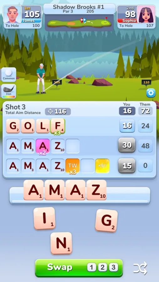 Pick letter tiles, build words, and play them to power up your golf club to do the best swing. Play solo to relax, or challenge an opponent and prove you are the best in the fairway.