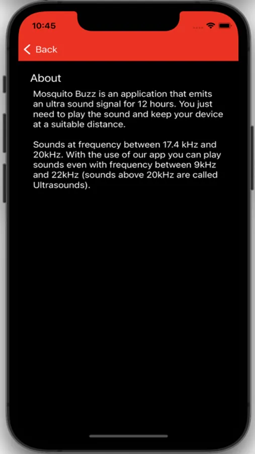 Sounds at frequency between 17.4 kHz and 20kHz. With the use of our app you can play sounds even with frequency between 9kHz and 22kHz (sounds above 20kHz are called Ultrasounds).