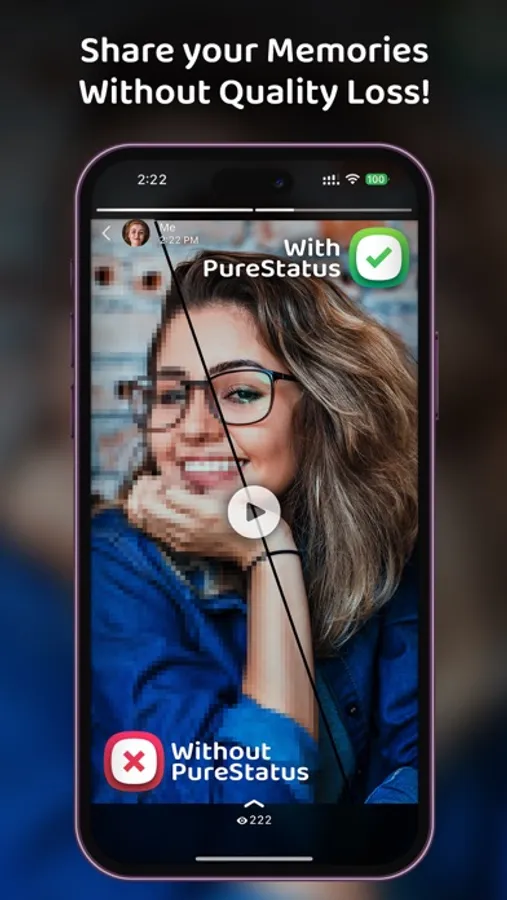 No more pixel loss when sharing WhatsApp status, thanks to our innovative image & video compressor app. With PureStatus, you can post WhatsApp statuses without compromising video & photo quality.