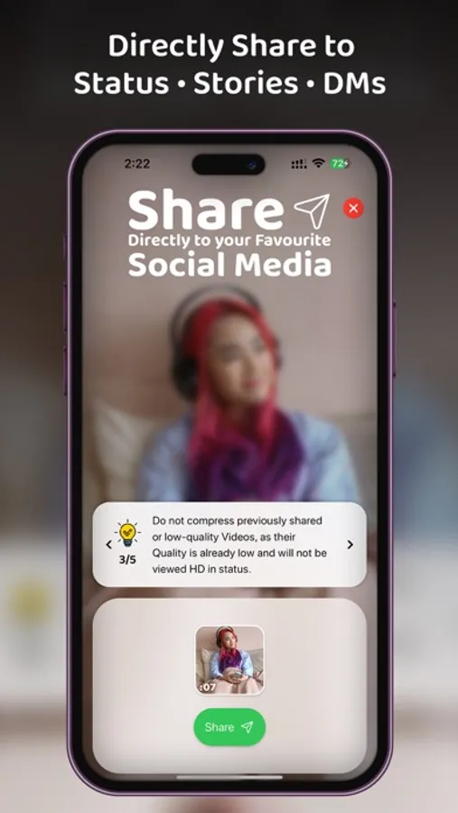 2. Do not compress previously shared videos, as their quality has already become low and low-quality videos will not be improved for Status. So, Always Compress High-Quality Videos in PureStatus.
