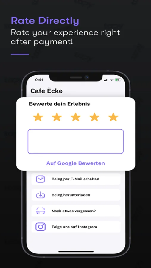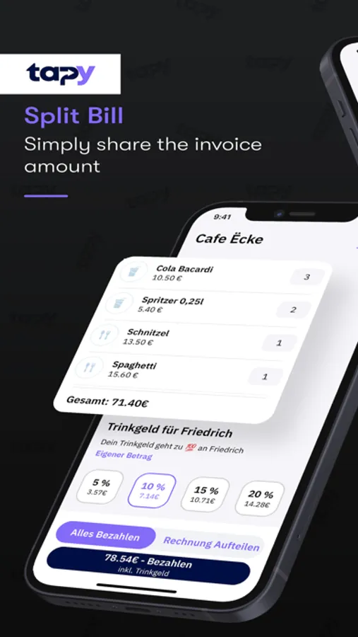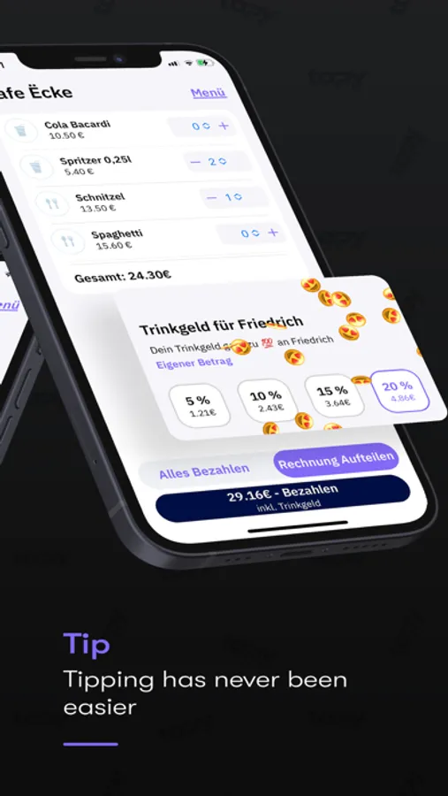 tapy makes it easy and convenient to pay and order in restaurants, cafés and bistros. You no longer have to wait for the service staff to pay or order, but can simply scan the QR code on the table to start your stay.