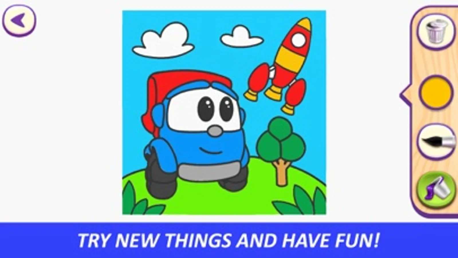 Color in pictures with the paintbrush by moving your finger or by filling in separate sections with the “bucket” tool.