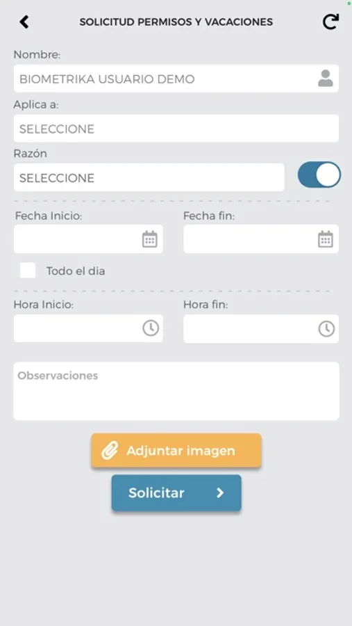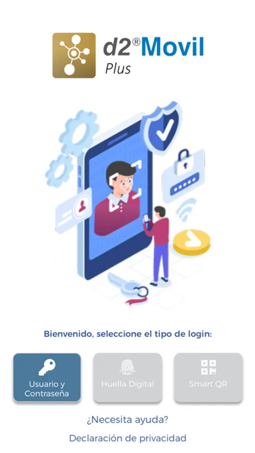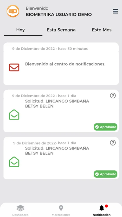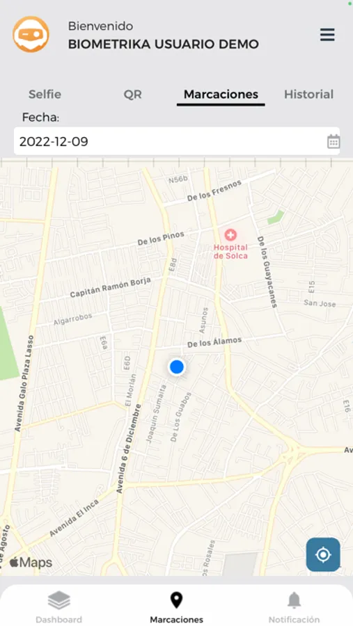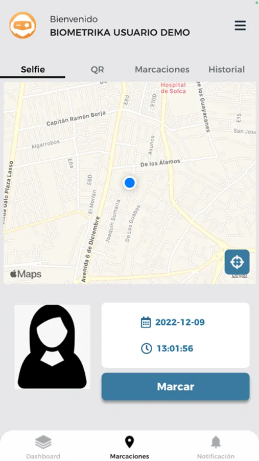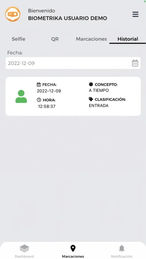 Aplicación de la empresa BIOMETRIKA S.A para realizar marcaciones remotas online/ offline por toma de fotografía o lectura de códigos QR, recibir notificaciones de permisos y utilización de servicios del sistema d2Web.