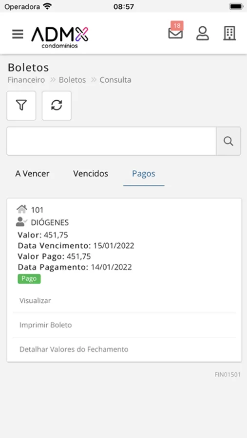 - Visualização de boletos em aberto para sua unidade;