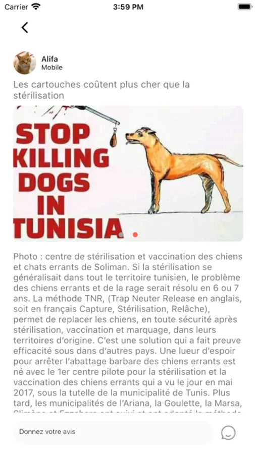 Alifa Annonce : pour trouver de l’aide. Alifa Alert, en cas de perte de votre animal, vous serez contacté directement si votre animal est signalé ou trouvé. Alifa Help pour signaler un animal perdu ou en difficulté, ou encore Alifa Solidarty pour mobiliser et collecter de fonds pour la cause animale.