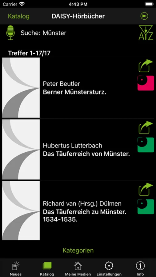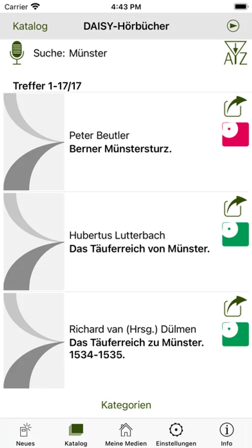 + Suche mit Filtern in den Katalogen + Detaillierte Informationen zu jedem einzelnen Titel + Hörprobe + Download bzw. Streaming von DAISY-Hörbüchern + Bestellung der Titel auch auf CD oder für SD-Karten bzw. USB-Sticks inkl. kostenfreiem Versand