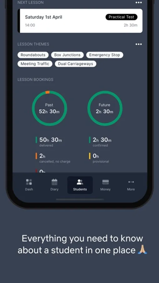 The MyDriveTime STUDENTS module stores everything you need to know about your students. Instantly access their profile, learning progress, test attempts and lesson history. Effortlessly track money paid, lessons delivered and any pre-paid time remaining. Integration with Diary and Money ensures your full student record is always at your fingertips.