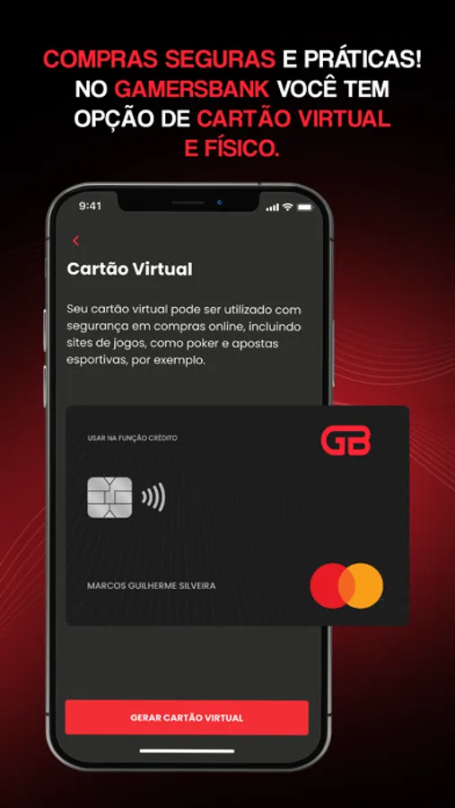 Sempre que quiser comprar online, você pode usar seu cartão virtual GamersBank direto no app, gratuitamente. Com ele você garante ainda mais proteção para os seus dados e não precisa estar com o cartão físico por perto para fazer compras na internet.