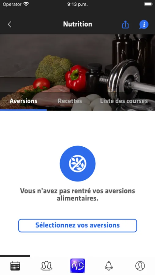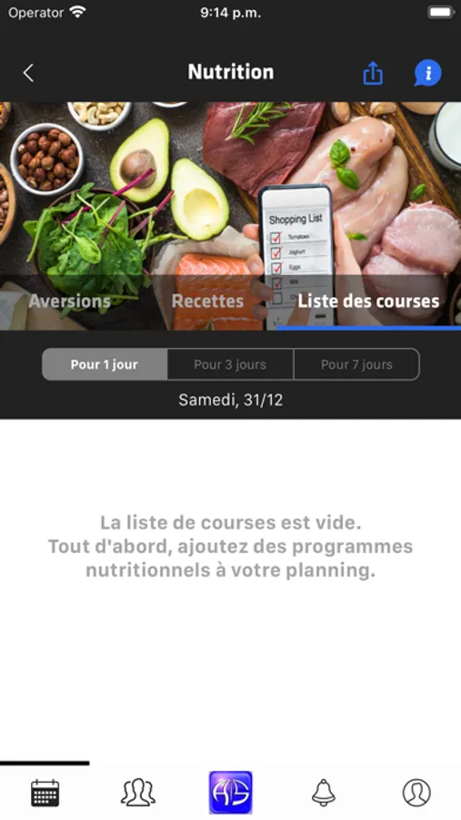 L’onglet nutrition permettra de renseigner tes aversions alimentaires. Des variantes des aliments te sont proposées. Ta liste de courses se génèrera automatiquement après saisie de tes menus et s’adaptera en temps réel, aux repas ajoutés à ton planning.