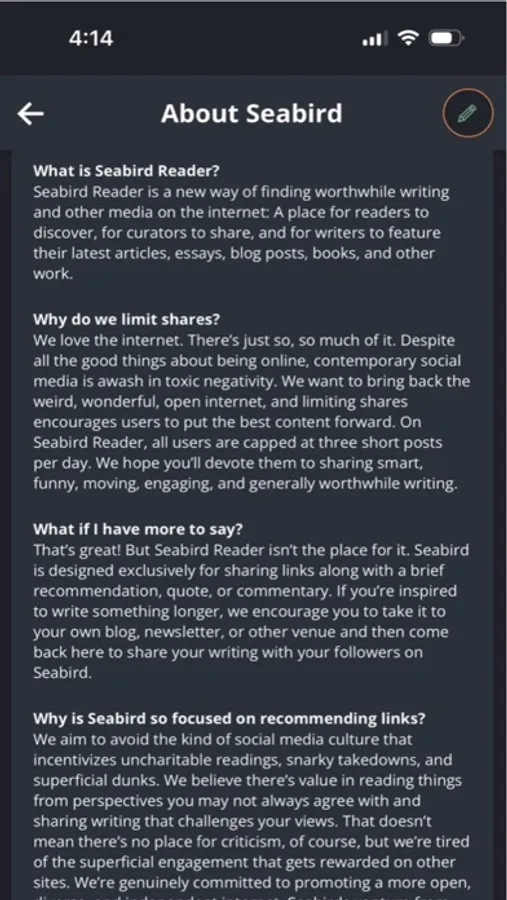 We love the internet. There’s just so, so much of it. Despite all the good things about being online, contemporary social media is awash in toxic negativity. We want to bring back the weird, wonderful, open internet, and limiting shares encourages users to put the best content forward. On Seabird, all users are capped at three short posts per day. We hope you’ll devote them to sharing smart, funny, moving, engaging, and generally worthwhile writing.