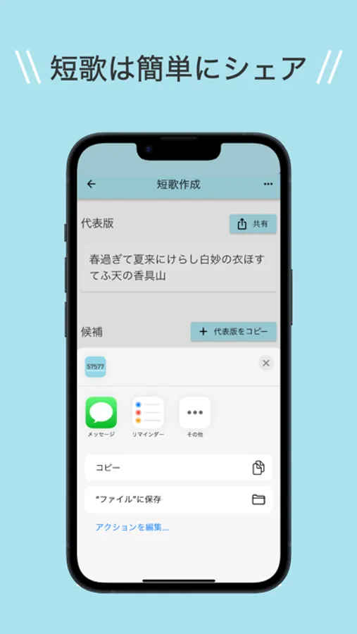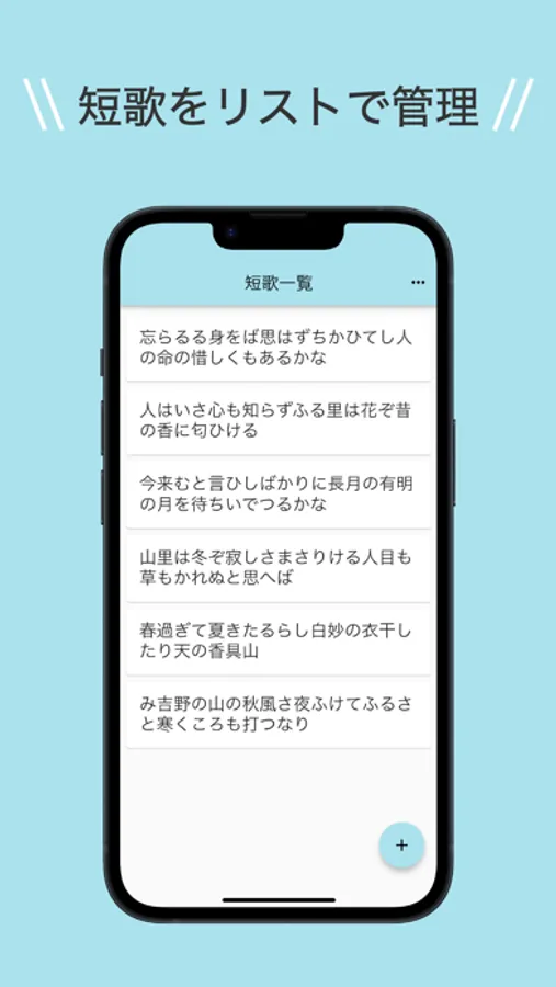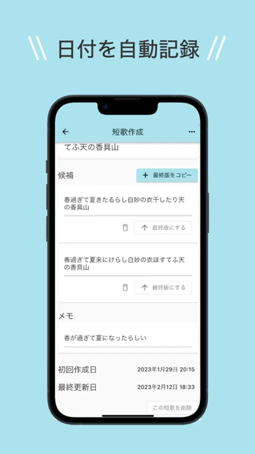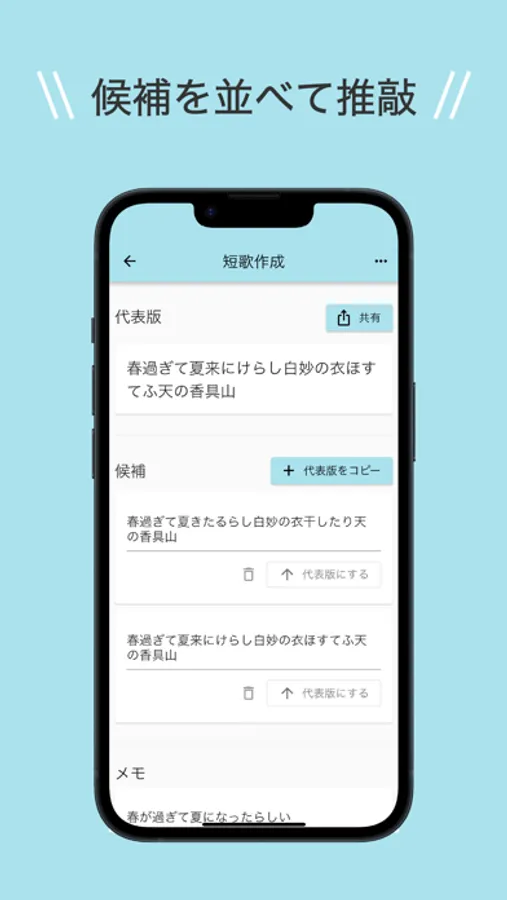 候補を複数つくって推敲したり、メモを一緒に残したり、スマホでの短歌、俳句制作に特化したアプリです。