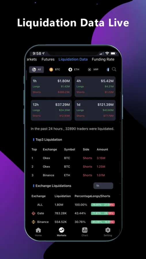 2. The real-time liquidation statistics of each exchange, it is very intuitive to view the long and shorts liquidation through the chart and ranking list