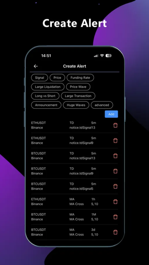 3. Create custom reminders for the currency which you concerned about, such as: price, short-term violent fluctuation, funding rate, large-value liquidation, long-short ratio, large-value transfer reminders for wallet addresses on the chain, when You will be notified when your cryptocurrency alert goal has been reached!
