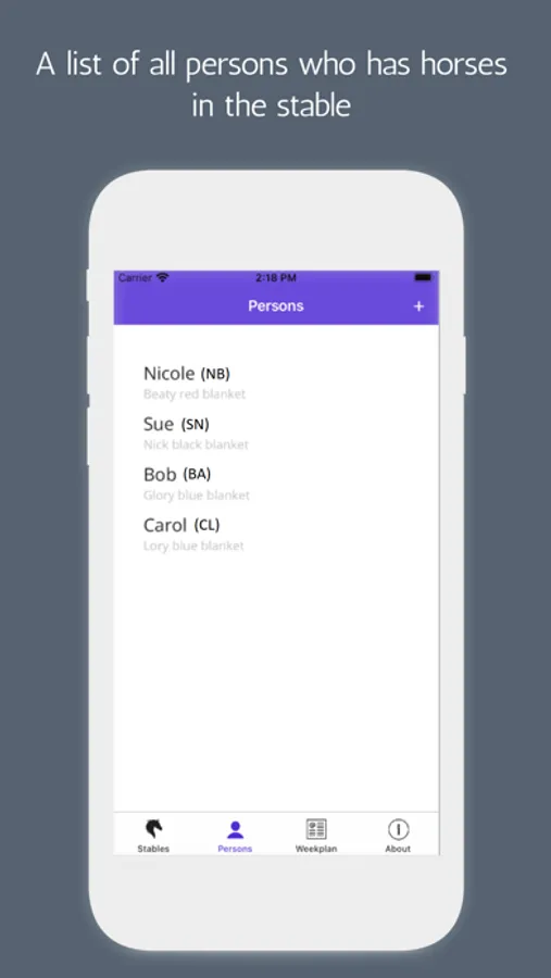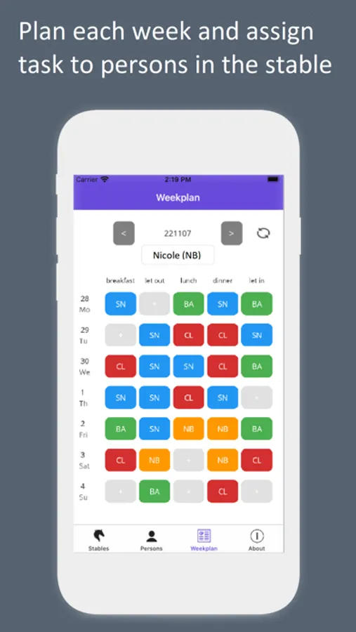 The app is primarily designed for dealing with tasks at a horse farm but can be used for any kind of scenario where you want to assign tasks to people week by week. An example of tasks could be moving horses in and out of stalls, providing feeds at different times of the day.