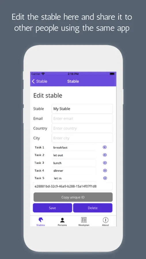 The user starts off by creating a stable in the app and then all people that work in that stable connect to it by inserting a code that they get from the creator. Your team is then all connected and can share tasks
