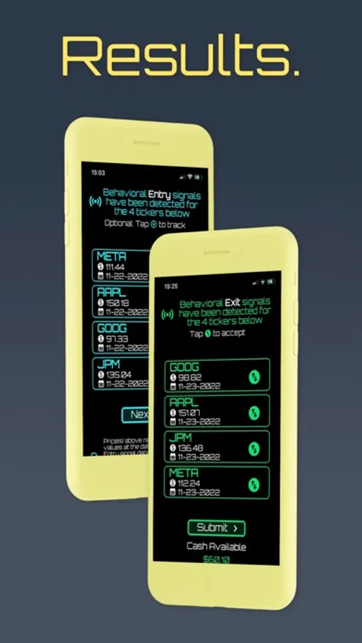 *Screenshots above are for display purposes only and do not represent actual results reported by our app and algorithmic system.