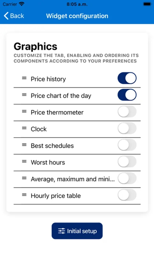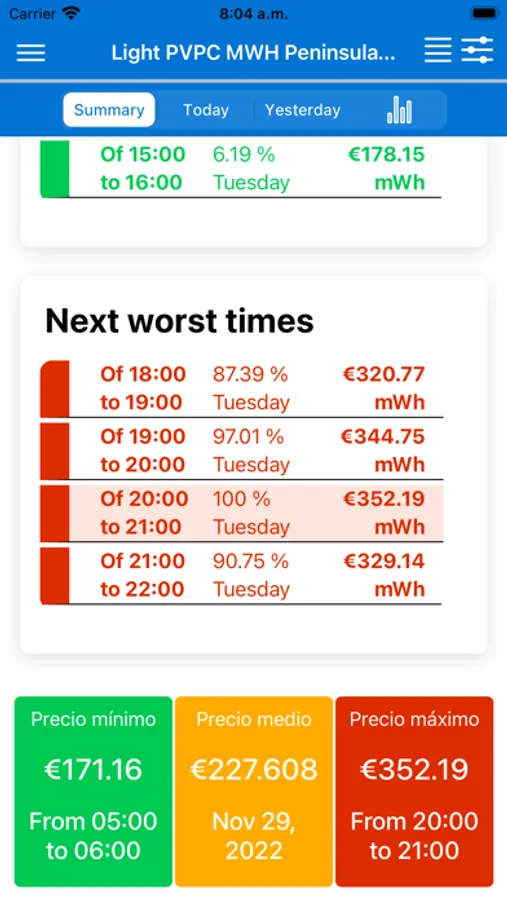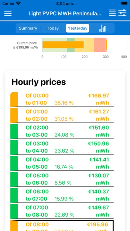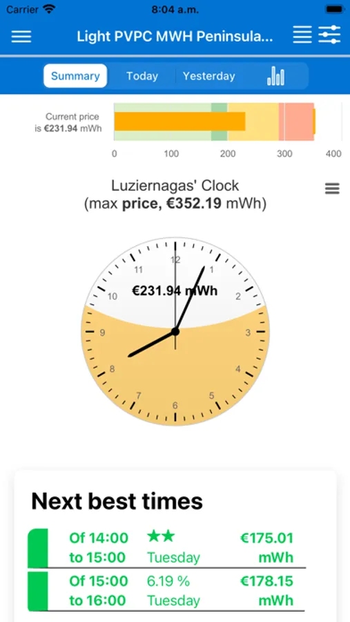 For this purpose, we provide you with different visual components (widgets) that will allow you to control in a very simple and intuitive way the prices of the day as well as the prices of the following day, from the time of their publication.