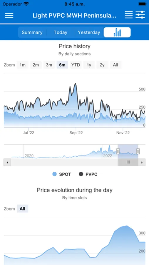 You can consult the daily evolution of the price in the form of a graph. You can also see the entire price history, comparing the PVPC price and the SPOT price so that you can easily see how they evolve with respect to each other.