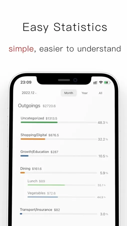 CostMemo also supports categories as well as secondary categories, and they are reflected in the final statistics charts in a clear and concise way. You can also completely define your own set of category lists, for example for specific moments like home renovations, with custom categories that will make your bookkeeping much easier.