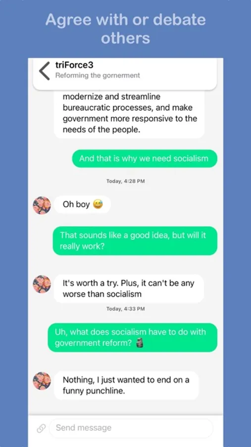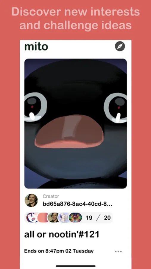 But what sets our app apart is the way it keeps the conversation fresh: when the time runs out and the group is full, it splits into two new groups. And depending on your settings, the new groups can be bigger, smaller, or the same size, and even split users into groups of people who are similar or dissimilar to each other. So you can customize your chat experience to create a healthy discourse and understand different perspectives or find similar minds.