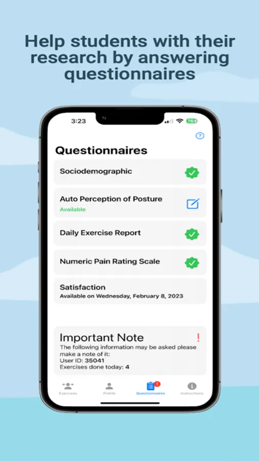 - Optionally answer questionnaires to help Doctoral students with their research on tech neck syndrome related usage.
