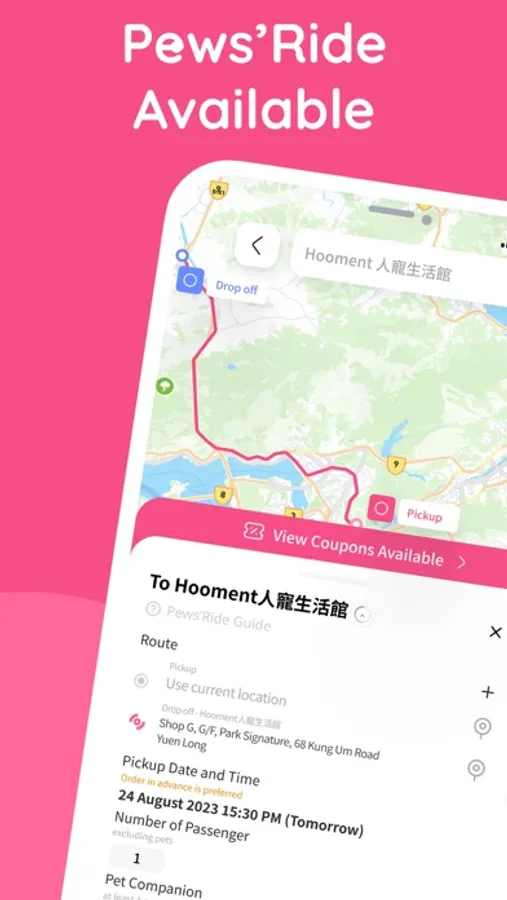 Travel with your furry companion anywhere with a tap of a button on Pews'!