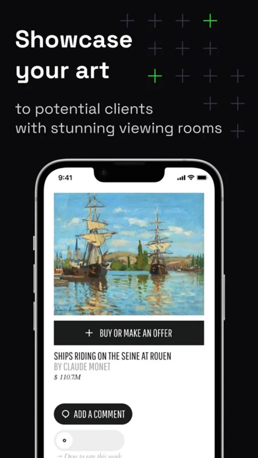 Create viewing rooms with unique URLs to send to clients via email or social networks. Viewers can review your proposed artworks on a responsive landing page and leave their comments and reactions (Love it, Not for me, etc.). You can see their feedback instantly in the app and can adjust your offering if needed.