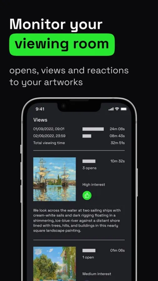 ArtUp is an all-in-one app for artwork management. It allows you to store your art portfolio in a secure place and showcase artworks in stylish interiors through web-based viewing rooms. Send links to potential buyers and receive their comments and reactions instantly.