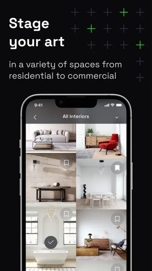 Showcase your artworks in their real dimensions in stylish interiors created exclusively for ArtUp by interior design experts. Artworks are placed anywhere on the wall behind furniture and décor objects to create a photorealistic rendering. Change wall colours and adjust drop shadows as needed.